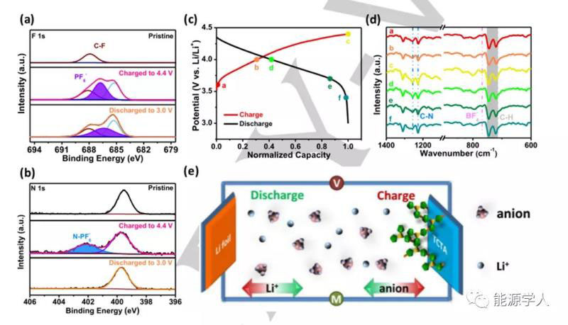 圖4. TCTA正極在不同充/放電狀態(tài)下的高分辨率XPS(a)F 1s和(b)N 1s光譜,(c)恒電流充/放電曲線,(d)相應(yīng)的非原位FT-IR譜,(e)鋰-TCTA電池的電化學(xué)反應(yīng)機(jī)理示意圖。