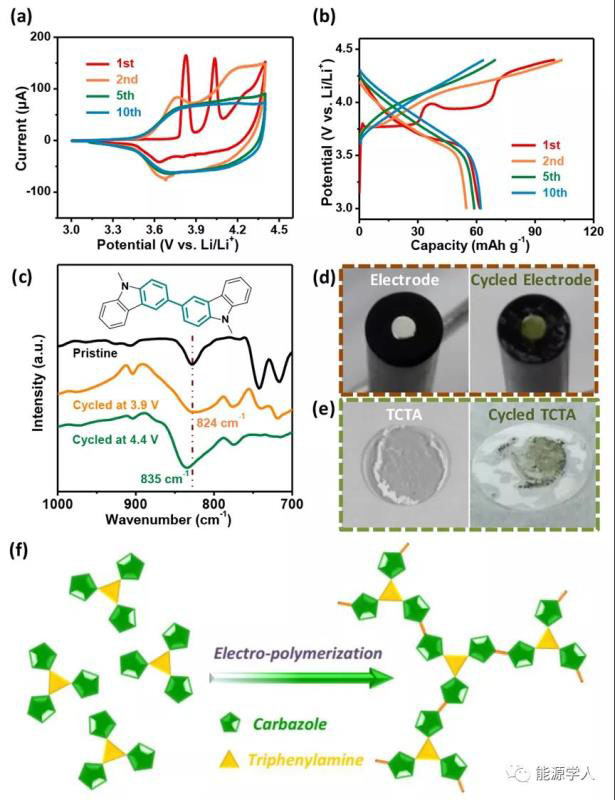 圖1 (a)0.1 mV s-1時(shí)的CV曲線(b)TCTA正極在200 mA g-1時(shí)的恒電流充/放電曲線,(c)TCTA正極在3.9 V和4.4 V循環(huán)前后的FT-IR光譜,(d-e)電化學(xué)循環(huán)前后的TCTA膜的示意圖,(f)電聚合過(guò)程的示意圖。