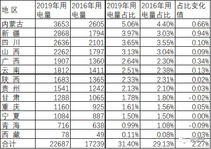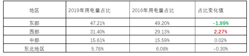 綜上所述,2016~2019年間,西部地區(qū)盡管用電量絕對(duì)值不及東部地區(qū),但是其對(duì)新增用電量的貢獻(xiàn)明顯大于東部地區(qū)。