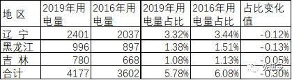 東北地區(qū)2016~2019年用電量全國(guó)占比減少0.3個(gè)百分點(diǎn),區(qū)域內(nèi)三省的全國(guó)用電量占比均減少。