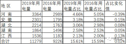 中部5省2016~2019年用電量占比微增0.02個(gè)百分點(diǎn),對(duì)全國(guó)用電量增長(zhǎng)的推動(dòng)作用基本保持不變。河南省是區(qū)域內(nèi)唯一用電量占比下降的省份。