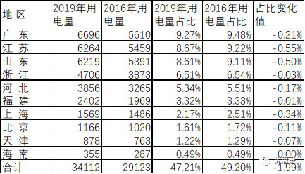 東部地區(qū)2016~2019年用電量全國(guó)占比下降1.99個(gè)百分點(diǎn),對(duì)全國(guó)用電量增長(zhǎng)的推動(dòng)作用明顯減弱。分省看,除海南外,各省2019年用電量全國(guó)占比均比2016年下降,其中,江蘇、山東、上海、廣東、河北的用電量占比降低明顯。
