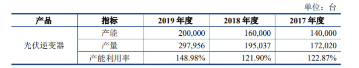 錦浪科技表示,項(xiàng)目建設(shè)有利于提高產(chǎn)能,滿足不斷增長(zhǎng)的市場(chǎng)需求。近年來(lái)錦浪科技產(chǎn)品銷售增長(zhǎng)較快,2017年度、2018年度、2019年度,公司營(yíng)業(yè)收入分別為8.235億元、8.314億元以及11.39億元,2017年至2019年?duì)I業(yè)收入年均復(fù)合增長(zhǎng)率為17.61%。2019年全年?duì)I業(yè)收入相較于上市前2018年度增長(zhǎng)37.01%,增幅快速擴(kuò)大。2017年至2019年,錦浪逆變器產(chǎn)能、產(chǎn)量及產(chǎn)能利用率統(tǒng)計(jì)情況如下: