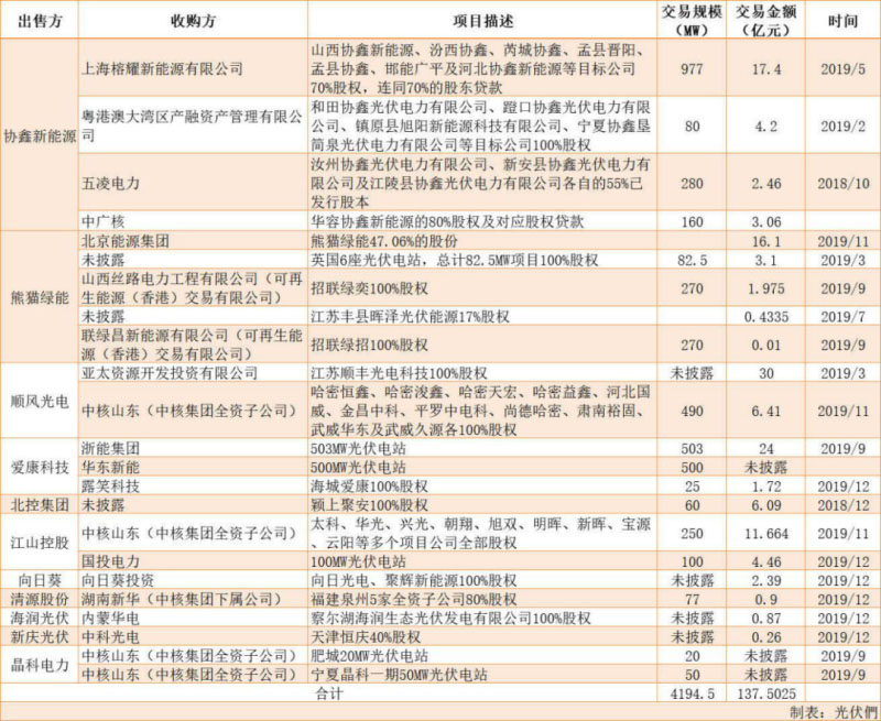 而以協(xié)鑫、熊貓綠能為代表的民營企業(yè)受限于補(bǔ)貼拖欠問題,在2019年加快出售電站的步伐。據(jù)不完全統(tǒng)計(jì),2019年有超過4GW光伏電站進(jìn)行出售,交易金額近140億元。
