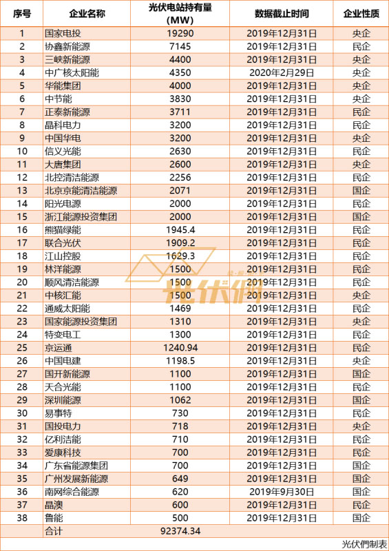 2019年底,中國光伏累計(jì)裝機(jī)突破200GW大關(guān),而光伏電站的投資格局也在悄然發(fā)生著變化,光伏電站的聚集度正逐漸提高。光伏們根據(jù)2019年光伏企業(yè)陸續(xù)公布的財(cái)報(bào)、央企的社會(huì)責(zé)任報(bào)告以及采訪調(diào)研,統(tǒng)計(jì)了38家光伏電站投資商截止到2019年底的電站持有量業(yè),總計(jì)約92.4GW,占國內(nèi)總裝機(jī)的45.23%左右。