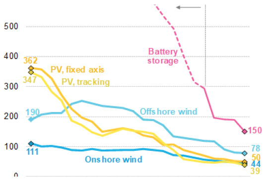 中國(guó)儲(chǔ)能網(wǎng)訊:根據(jù)彭博新能源財(cái)經(jīng)公司最新發(fā)布的一份可再生能源平準(zhǔn)化電力成本(LCOE)的分析報(bào)告,全球太陽(yáng)能發(fā)電設(shè)施的平準(zhǔn)化電力成本已降至30美元/MWh以下,并且有望在十年內(nèi)下降到20美元/MWh。目前較低的平準(zhǔn)化電力成本(LCOE)意味著電池儲(chǔ)能系統(tǒng)不再需要補(bǔ)貼,就短期到中期平衡的應(yīng)用而言更具有市場(chǎng)競(jìng)爭(zhēng)力。