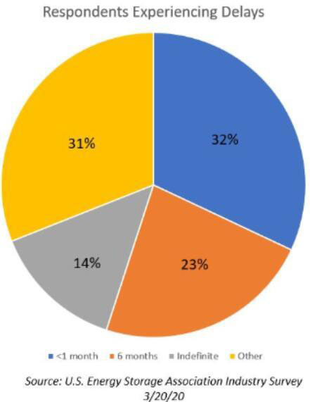 美國在三月份對儲能協(xié)會175名成員進行的民意調查結果顯示,有62%的受訪者表示正遭遇儲能項目被延誤,44%的人認為會受到一個月的短期影響,而37%預計延誤將持續(xù)六個月或更長時間,還有一部分人則無法預估項目到底會停滯多久。