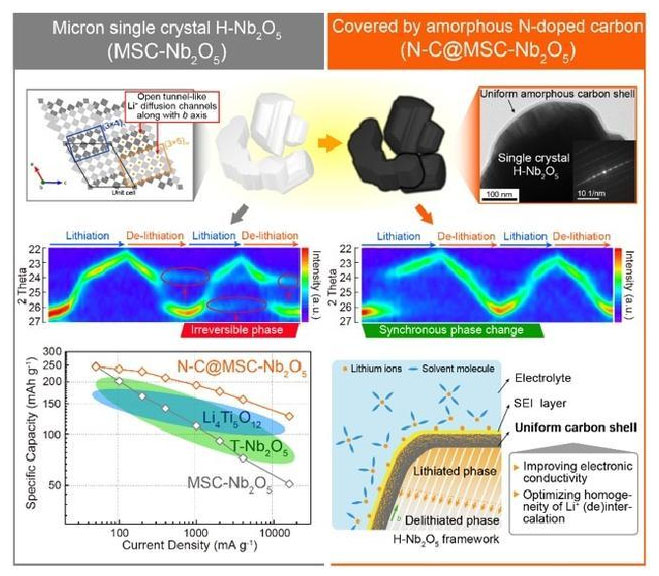 引入無定型碳層對H型Nb2O5晶體表界面電子和離子輸運(yùn)均勻性及結(jié)構(gòu)變化可逆性的改善策略示意圖