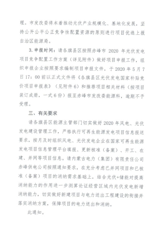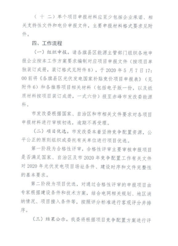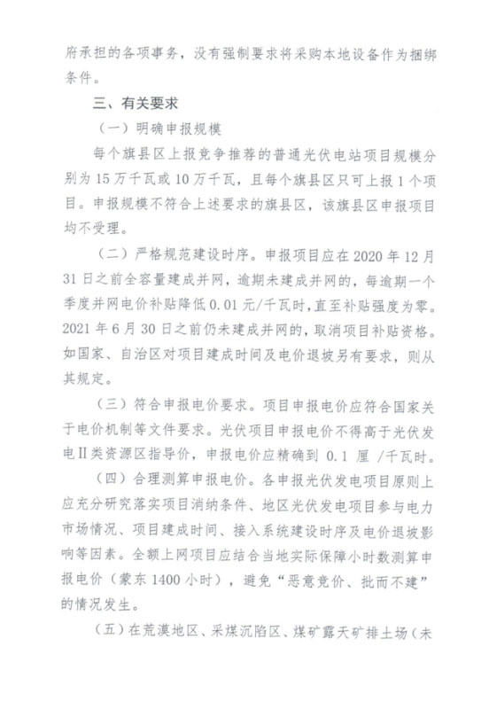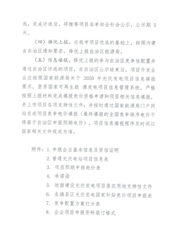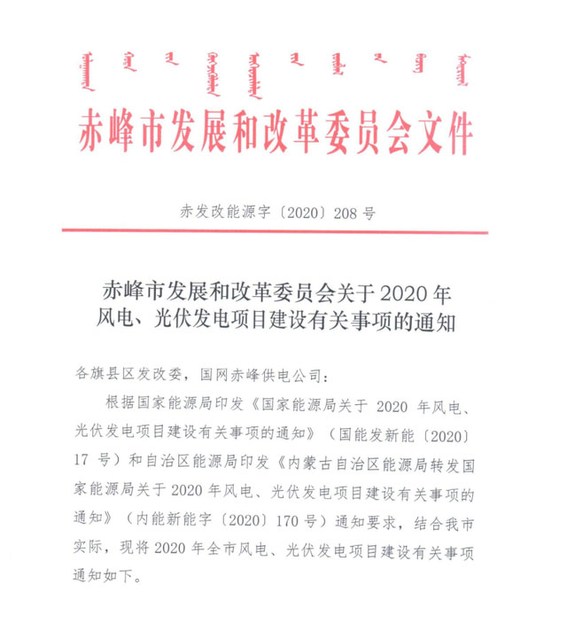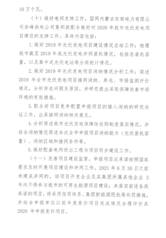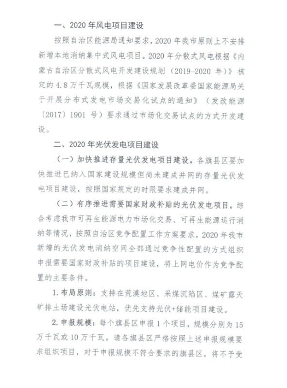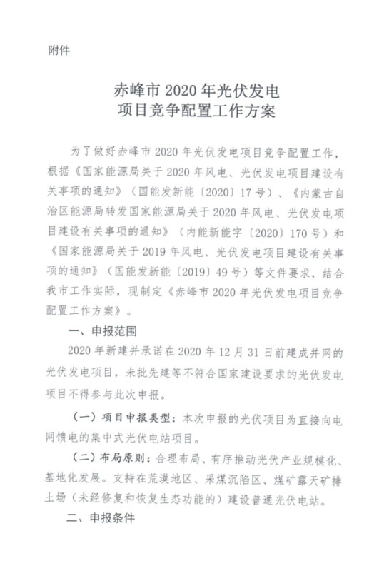 近日內(nèi)蒙古赤峰市發(fā)改委印發(fā)《赤峰市2020年光伏發(fā)電項目競爭配置工作方案》,其中指出優(yōu)先支持對提高電網(wǎng)消納能力效果好且具備價格競爭力的電站項目。如果普通光伏電站配置儲能系統(tǒng),則應保證儲能系統(tǒng)時長為1小時及以上、配置容量達到項目建設規(guī)模(即預計備案規(guī)模)5%及以上,并提出儲能配置對提高電網(wǎng)消納能力的實施方案,承諾接受電網(wǎng)調(diào)度。