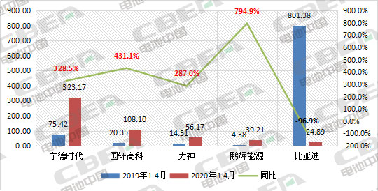 圖:2020年1-4月動(dòng)力電池裝機(jī)量排名前五企業(yè)分析;數(shù)據(jù)來源:動(dòng)力電池應(yīng)用分會(huì)研究部
