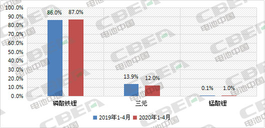 圖:2020年1-4月專用車搭載動(dòng)力電池占比分析;數(shù)據(jù)來源:動(dòng)力電池應(yīng)用分會(huì)研究部