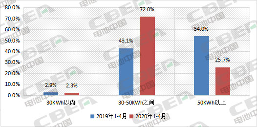 圖:2020年1-4月專用車帶電量分布;數(shù)據(jù)來源:動(dòng)力電池應(yīng)用分會(huì)研究部