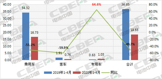 動(dòng)力電池應(yīng)用分會(huì)研究部統(tǒng)計(jì)的數(shù)據(jù)顯示,2020年1-4月新能源汽車產(chǎn)量累計(jì)18.53萬輛,同比下滑49.7%;搭載的動(dòng)力電池裝機(jī)量9.28GWh,同比下降47.6%。其中,新能源專用車產(chǎn)量累計(jì)1.03萬輛,同比增長(zhǎng)64.6%,搭載的動(dòng)力電池裝機(jī)量0.63GWh,同比下降40.9%。