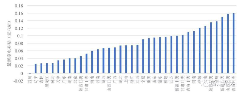 先來看一下現(xiàn)有指導電價下,各省、地區(qū)的補貼強度,在-0.0012元/kWh~0.16元/kWh之間,如下圖所示。