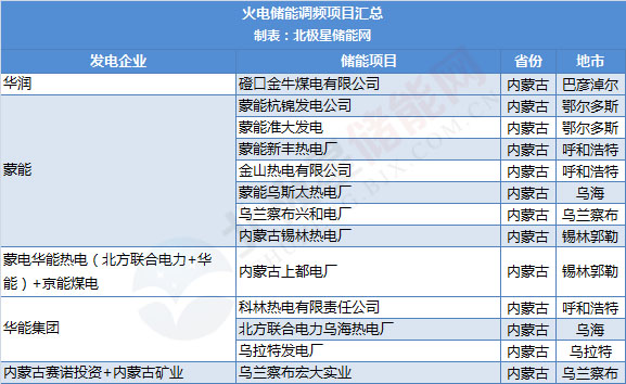 以上主要為風(fēng)電、光伏等新能源發(fā)電側(cè)配置儲能項(xiàng)目動態(tài),除此之外,據(jù)北極星儲能網(wǎng)統(tǒng)計(jì),內(nèi)蒙古地區(qū)還有蒙能集團(tuán)、華潤集團(tuán)華能集團(tuán)等開展了13個(gè)火電儲能聯(lián)合調(diào)頻項(xiàng)目。