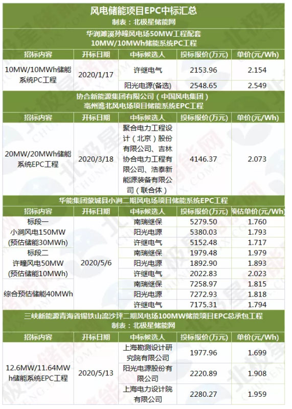 5月13日該項(xiàng)目發(fā)布中標(biāo)公示,第一候選人為上??睖y設(shè)計(jì)研究院有限公司、投標(biāo)總價(jià)1977.96萬元,單價(jià)約1.699元/Wh,再次打破了前不久華能蒙城小澗項(xiàng)目風(fēng)儲EPC工程的最低單價(jià)記錄。另外,項(xiàng)目第二中標(biāo)候選人陽光電源投標(biāo)總價(jià)2220.89萬元,上海電力設(shè)計(jì)院為第三中標(biāo)候選人、投標(biāo)總價(jià)2280.27萬元。2020年風(fēng)電儲能項(xiàng)目中標(biāo)詳情如下。