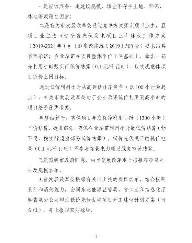 文件還指出光伏風電需承諾在項目整體平價上網(wǎng)基礎(chǔ)上,拿出一部分利用小時數(shù)實行低價結(jié)算(0.1元/kWh);且低價光伏、風電項目的低價電量(0.1元/kWh)不參與東北電力輔助服務(wù)市場。