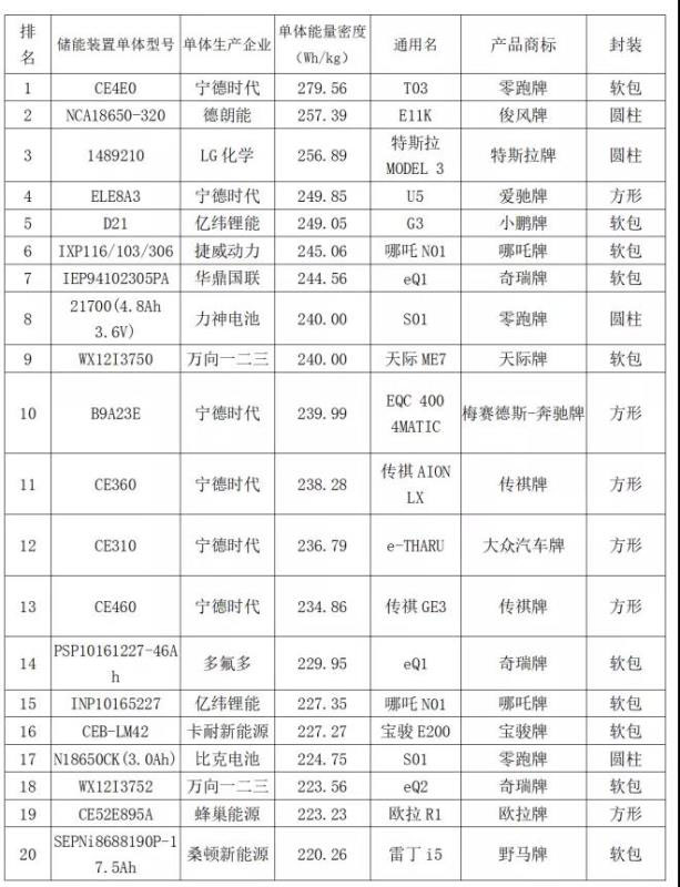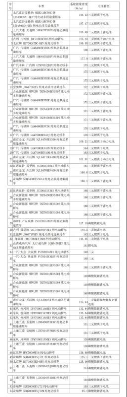 新能源汽車推廣應(yīng)用推薦車型目錄(2020 年 第 5 批)純電乘用車系統(tǒng)能量密度排行榜