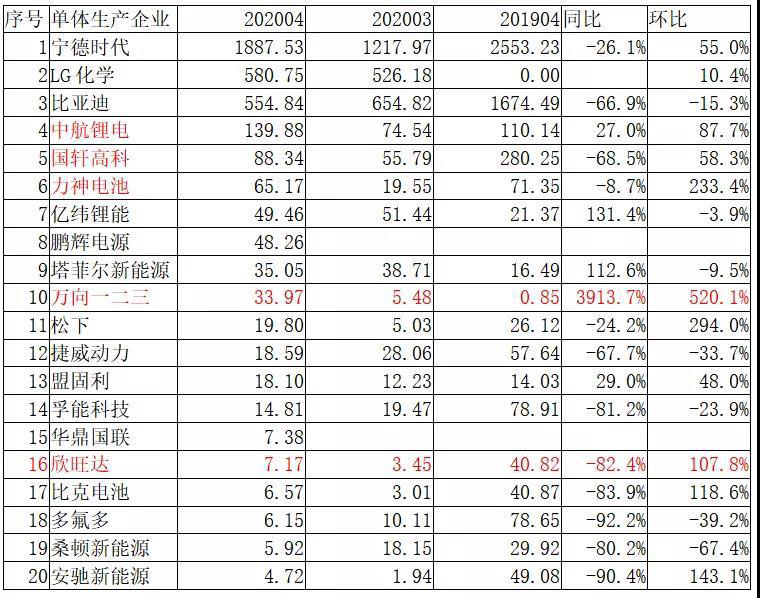 4月動(dòng)力電池企業(yè)裝機(jī)情況(單位MWh)