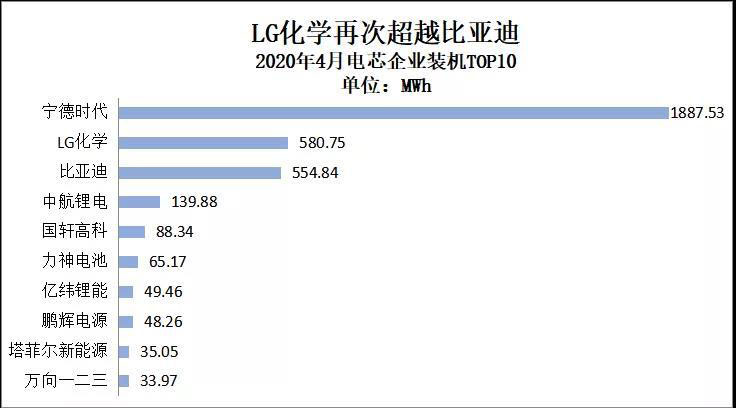比亞迪的地位并不穩(wěn)定。4月份,比亞迪裝機(jī)占比再次下滑至15.4%,低于第二名LG化學(xué)16.1%的占比。在大部分企業(yè),4月份裝機(jī)大幅度增長(zhǎng)到時(shí)候,比亞迪再次同環(huán)比雙雙下滑,裝機(jī)量同比下滑66.9%,環(huán)比下滑15.3%,將第二名再次讓與LG化學(xué)。LG化學(xué)的崛起嚴(yán)重威脅到比亞迪的地位。