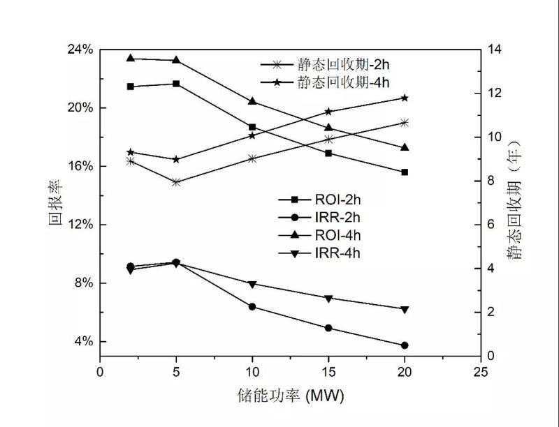 圖4. 不同規(guī)模不同時長儲能投資回報率和回收期