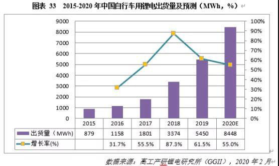 高工產(chǎn)研鋰電研究所(GGII)數(shù)據(jù)顯示,受下游需求強勢拉動,2019年中國自行車用鋰電池出貨量達5.450GWh,同比增長61.5%。預(yù)計2020年將提升至8.448GWh,同比增長55%。
