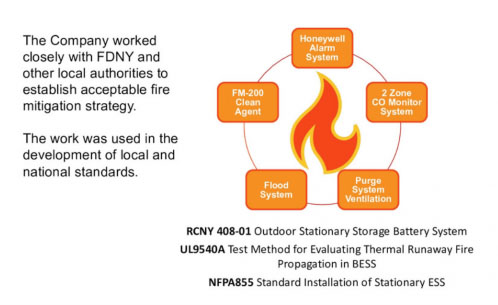 為了確保紐約州運營和部署的儲能系統(tǒng)消防安全,Kamaludeen指出了愛迪生聯(lián)合電氣公司采取的5個措施和方法。其中包括使用霍尼韋爾警報系統(tǒng)、一氧化碳監(jiān)測系統(tǒng)、凈化系統(tǒng)通風、溢流系統(tǒng)和FM-200清潔劑。這些方法已經(jīng)應(yīng)用在該公司位于紐約市皇后區(qū)部署裝機容量為2MW儲能系統(tǒng)中。他重申,在紐約州這樣人口密集的城市地區(qū),業(yè)界人士對儲能系統(tǒng)消防安全的關(guān)注變得更加突出。