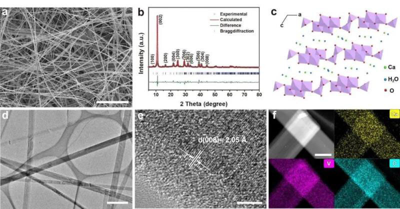 圖1 CaVO納米帶的形貌與結(jié)構(gòu)表征。(a) SEM圖;(b)XRD精修圖;(c)晶體結(jié)構(gòu)圖;(d)TEM圖;(e)高分辨TEM圖;(f)元素分布圖。