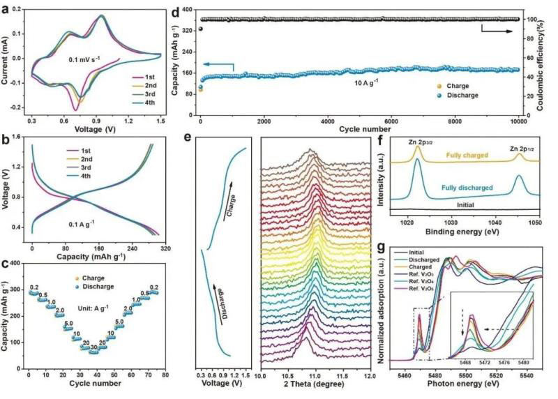 圖2 Zn/CaVO電池的電化學(xué)性能與儲能機理。(a) CV圖;(b)恒流充放電曲線;(c)倍率性能;(d)長循環(huán)性能;(e)原位XRD;(f) Zn 2p的XPS譜圖;(g) V K-edge XANES譜圖。