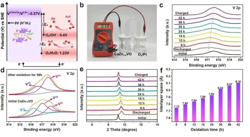 圖3 CaZn3.6VO與O2氧化還原反應(yīng)機理。(a)能級圖;(b)原電池光學(xué)照片;(c)不同氧化時間的V 2p XPS譜圖;(d) 氧化反應(yīng)36h后電極與放電電極V 2p XPS的對比圖;(e)不同氧化時間的XRD圖;(f)對應(yīng)不同氧化時間電極的(002)晶面間距計算結(jié)果圖。