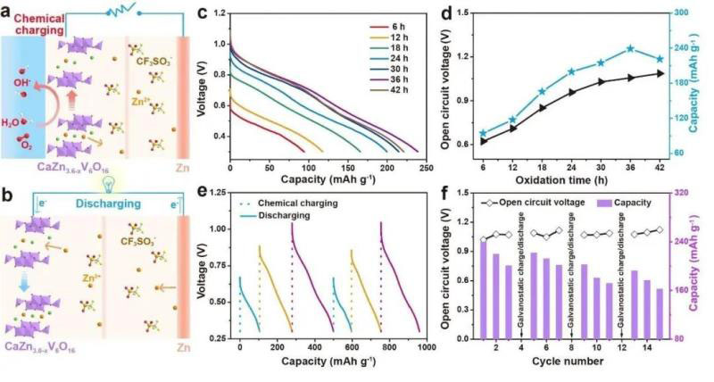 在恒電流充電的過程中,放電后的正極(CaZn3.6VO)失電子,釩被氧化,同時鋅離子從層間脫出,該過程的電子轉(zhuǎn)移是由外部電源驅(qū)動的。除上述的電化學(xué)氧化過程,自發(fā)的氧化還原反應(yīng)也是實現(xiàn)電子轉(zhuǎn)移的一種有效而直接的方法,它是由反應(yīng)物之間的氧化還原電勢差(ΔE)驅(qū)動的。由于O2與CaZn3.6VO之間氧化還原電勢的差異,CaZn3.6VO傾向于釋放電子而被氧化,O2可以接受這些電子同時被還原(圖3a)。作者在驗證了O2與CaZn3.6VO氧化還原反應(yīng)的自發(fā)性后(圖3b),深入探討了CaZn3.6VO電極在4M Zn(CF3SO3)2溶液中與溶解氧反應(yīng)不同時間后的結(jié)構(gòu)演變(圖3 c-f)。隨著氧化時間的增加,V 2p XPS譜逐漸向高鍵能移動,表明在該過程中CaZn3.6VO中的V被氧化,同時,為了維持CaZn3.6VO中的電荷平衡,層間的鋅離子從結(jié)構(gòu)中脫出,導(dǎo)致層間距的增大。最終放電產(chǎn)物CaZn3.6VO在不使用任何外部電源的情況下恢復(fù)到了其充電狀態(tài)(CaZn3.6-xVO),這個反應(yīng)可被認為是一種自充電過程。