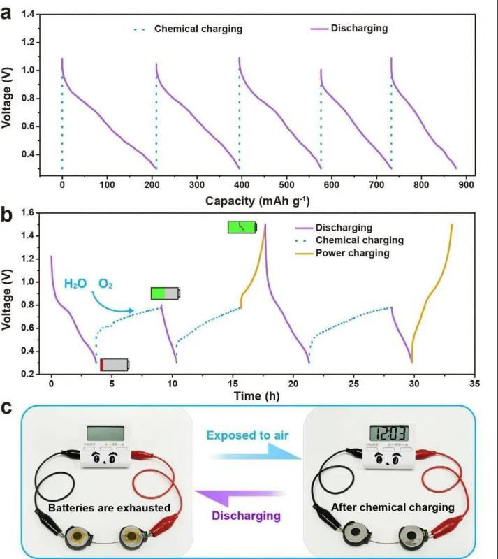 最后,作者組裝了“開放式”的扣式電池,在該體系中,氧氣通過正極殼的孔擴散進入電解液并與正極反應(yīng),從而實現(xiàn)原位的自充電過程。該體系具有良好的可自充性能(圖5a),并可在不同充放電模式下(化學(xué)自充電/恒流充電/恒流放電)工作(圖5b)。當(dāng)電池電量耗盡后,可將正極暴露于空氣中便可完成自充電過程,并能點亮計時器的液晶顯示屏,表明其可作為自充電儲能裝置去使用(圖5c)。