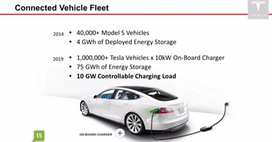 Straubel的演講PPT顯示,2019年,特斯拉總保有量會突破100萬輛,將會有超過10GW的可控充電負(fù)載,75GWh的電能存儲能力。實際情況是,特斯拉在2020年3月生產(chǎn)出了第100萬輛電動汽車。