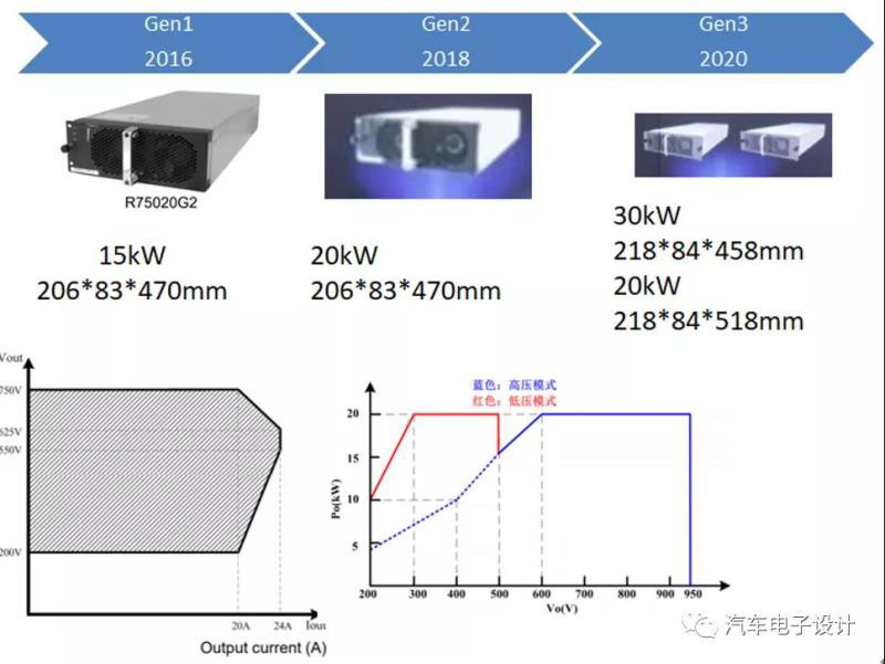 在整個(gè)直流快充模塊的降價(jià)和提高性能方面的過程中,華為扮演了一個(gè)挺有意思的角色。如下圖所示的華為充電模塊的Roadmap來看,是從開始的750V 15kW充電模塊,演化為500V&950V雙平臺(tái)的20kW模塊,到現(xiàn)在的國(guó)內(nèi)版30kW充電模塊和國(guó)外版20kW充電模塊。