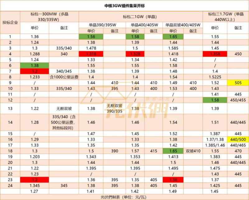 5月27日,中核集團2020年第一批組件集采今日開標(biāo),招標(biāo)規(guī)模共計3GW,分為三個標(biāo)段,共計24家組件企業(yè)參與投標(biāo)。具體開標(biāo)結(jié)果見下: