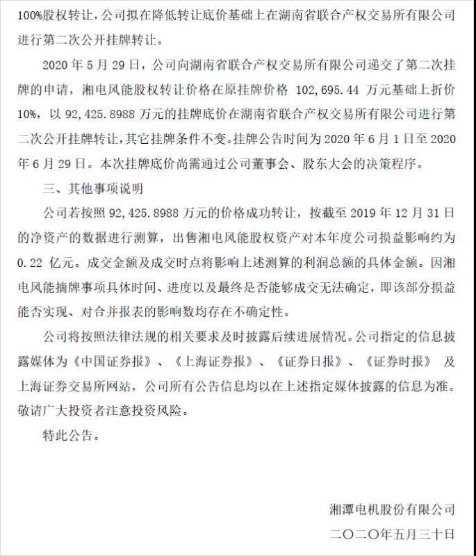 2020 年 5 月 29 日,公司向湖南省聯(lián)合產(chǎn)權(quán)交易所有限公司遞交了第二次掛牌的申請,湘電風(fēng)能股權(quán)轉(zhuǎn)讓價格在原掛牌價格 102,695.44 萬元基礎(chǔ)上折價10%,以 92,425.8988 萬元的掛牌底價在湖南省聯(lián)合產(chǎn)權(quán)交易所有限公司進(jìn)行第二次公開掛牌轉(zhuǎn)讓,其它掛牌條件不變。掛牌公告時間為 2020 年 6 月 1 日至 2020年 6 月 29 日。本次掛牌底價尚需通過公司董事會、股東大會的決策程序。