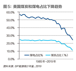 與美國煤炭和煤電占比不斷下降成為顯著對(duì)照,2005年以后,美國的天然氣和可再生能源消費(fèi)占比不斷提高。2019年美國煤炭地位發(fā)了歷史性的性的變化,降至11.3%,而可再生能源占比提高到11.4%。