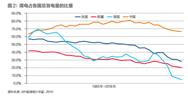 煤電而言,全球2018年煤電總發(fā)電量約10萬億千瓦時(shí),占全部發(fā)電量的比重為38%,其中中國煤炭發(fā)電量約為4.7萬億千瓦時(shí),占全球煤炭發(fā)電量的47%,不含中國全球煤炭發(fā)電量5.3萬億千瓦時(shí),煤電比重只有27%。號(hào)稱挺煤的美國,煤電的比重也從2005年50%以上,降低到2019年的25%,減少了25個(gè)百分點(diǎn)。比特朗普上臺(tái)前的2015年也減少5個(gè)百分點(diǎn)。歐盟煤電占比也從2005年的30%,降低到2019年的20%。英國從2009年宣布發(fā)展低碳經(jīng)濟(jì),逐步淘汰煤電,煤電占比已經(jīng)從2011年的30%左右,降低到2018年5%,2019年幾乎清零(詳見圖2)。