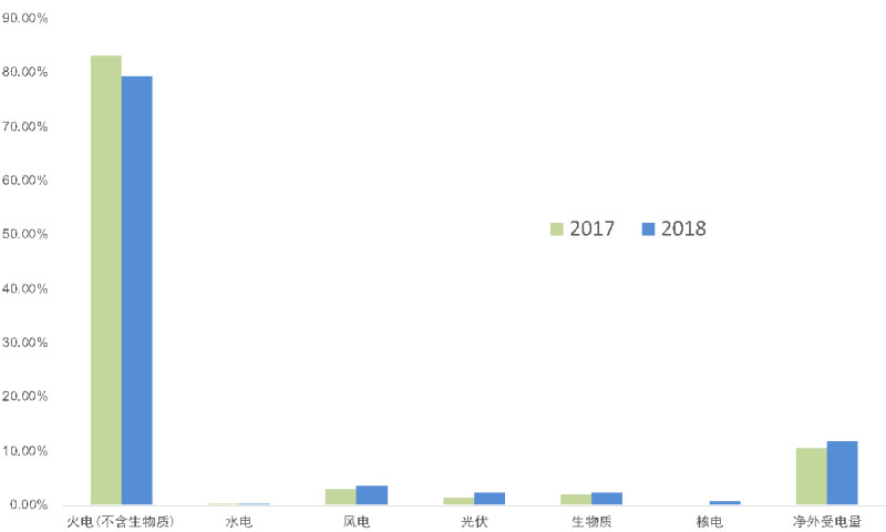 據(jù)國家統(tǒng)計局數(shù)據(jù),內蒙古2017年和2018年全省電量平衡構成如圖5所示。分析發(fā)現(xiàn),內蒙古電源結構以火力發(fā)電為主,電力外送量占總發(fā)電量比重超過30%。2018年,內蒙古全社會用電量增速達到15.95%,凈外送電量同比降低8%,可再生能源電力增速達到17%。但是內蒙古非水可再生消納量并沒有達到要求??梢?,隨著產(chǎn)業(yè)轉移的加速和西部地區(qū)終端用能電氣化率的提高,廉價電力為本省經(jīng)濟社會發(fā)展服務,特別是優(yōu)質可再生資源電力服務本省的訴求正在凸顯,這在可再生能源消納責任機制啟動后將愈加明顯。