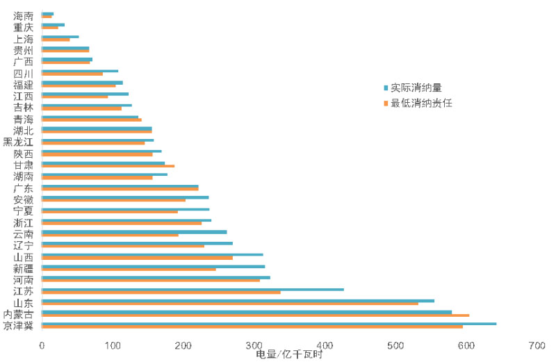圖2 2018年非水可再生能源消納量與最低消納責任