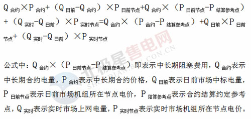 在目前的電力市場現(xiàn)貨結算中,實行節(jié)點邊際電價的地區(qū)都會產(chǎn)生阻塞費用。阻塞費用包括中長期阻塞費用和現(xiàn)貨阻塞費用兩部分。中長期阻塞費用普遍存在于中長期合約金融結算且現(xiàn)貨市場按偏差電量結算,合約雙方需約定合約金融交割點,對于合約結算來說就是結算參考點了,實質(zhì)上就是中長期差價合約結算的另一種表達。如下機組電能量結算公式所示: