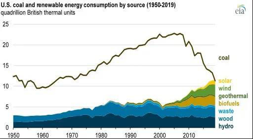 圖二:美國(guó)1950-2019年煤炭及可再生能源消耗量