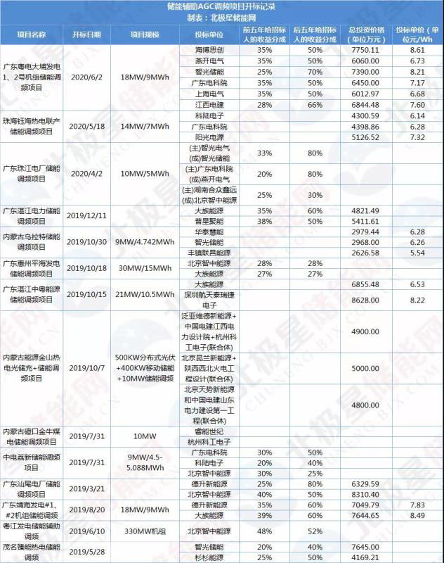 2019年儲(chǔ)能調(diào)頻是最熱門(mén)的應(yīng)用領(lǐng)域,上半年曾密集發(fā)布了多個(gè)項(xiàng)目招標(biāo);2020年近半年來(lái)僅有4個(gè)儲(chǔ)能調(diào)頻項(xiàng)目發(fā)布了招標(biāo)、中標(biāo)消息。據(jù)北極星儲(chǔ)能網(wǎng)不完全統(tǒng)計(jì),2019年以來(lái)儲(chǔ)能調(diào)頻報(bào)價(jià)并沒(méi)有太大降幅,投標(biāo)單價(jià)基本維持在6~8元/Wh。2019年曾有一家企業(yè)在內(nèi)蒙古烏拉特儲(chǔ)能調(diào)頻項(xiàng)目中以5.54元/Wh打破行業(yè)最低報(bào)價(jià)記錄,不過(guò)直到目前2020年最低單價(jià)報(bào)價(jià)記錄為珠海鈺海熱電聯(lián)產(chǎn)儲(chǔ)能調(diào)頻項(xiàng)目中科陸電子的6.14元/Wh。此次開(kāi)標(biāo)的大埔發(fā)電儲(chǔ)能調(diào)頻項(xiàng)目中,海博思創(chuàng)和智光電氣的投標(biāo)單價(jià)超過(guò)了8元/Wh。詳細(xì)如下:
