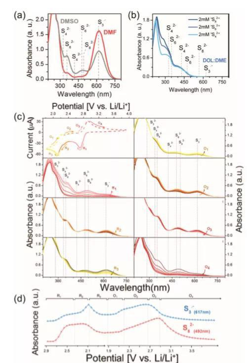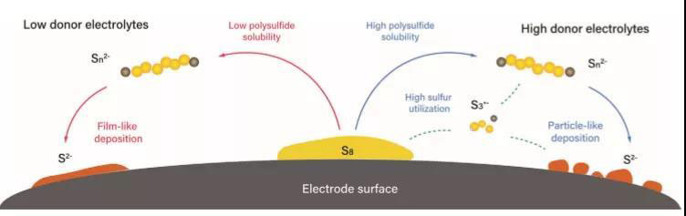 在尋找多硫化物高度可溶的溶劑方面,具有Gutmann給體數(shù)的電解質(zhì)具有很大的潛力。事實上,二甲基乙酰胺(DMA)和二甲基亞砜(DMSO)被證明在實際的鋰硫電池中具有基于多硫化物高溶解度的貧電解質(zhì)條件下的大比容。另一種高供體電解質(zhì),二甲基甲酰胺(DMF),也被證明能夠在鋰電池中放電,但這種電解質(zhì)尚未在貧電解質(zhì)條件下進(jìn)行評估。 因此,與傳統(tǒng)的1,3-二氧環(huán)烷/1,2-二甲氧基乙烷(DOL/DME)電解液相比,這些電解液可以提供更有效的途徑來獲得更高的能量密度。事實上,DOL/DME系統(tǒng)在室溫下只能溶解高達(dá)1m的Li2S6,一種在放電過程中產(chǎn)生的多硫化物。多硫化物在高給體電解質(zhì)中的高溶解度與多硫化物的歧化和解離途徑有關(guān)。這些在低施主電解質(zhì)中不可用的途徑涉及在充放電過程中生成三硫自由基陰離子(S3-)。這種自由基陰離子引發(fā)多種反應(yīng)途徑,即使對于含硫量較高的電極,也能充分利用硫。此外,高施主電解質(zhì)允許形成大顆粒形式的Li2S沉積物,而不是薄膜,這允許電極通過絕緣Li2S繞過鈍化,并保留其導(dǎo)電表面,以促進(jìn)長期循環(huán)過程中的穩(wěn)定氧化還原反應(yīng)。