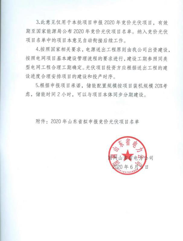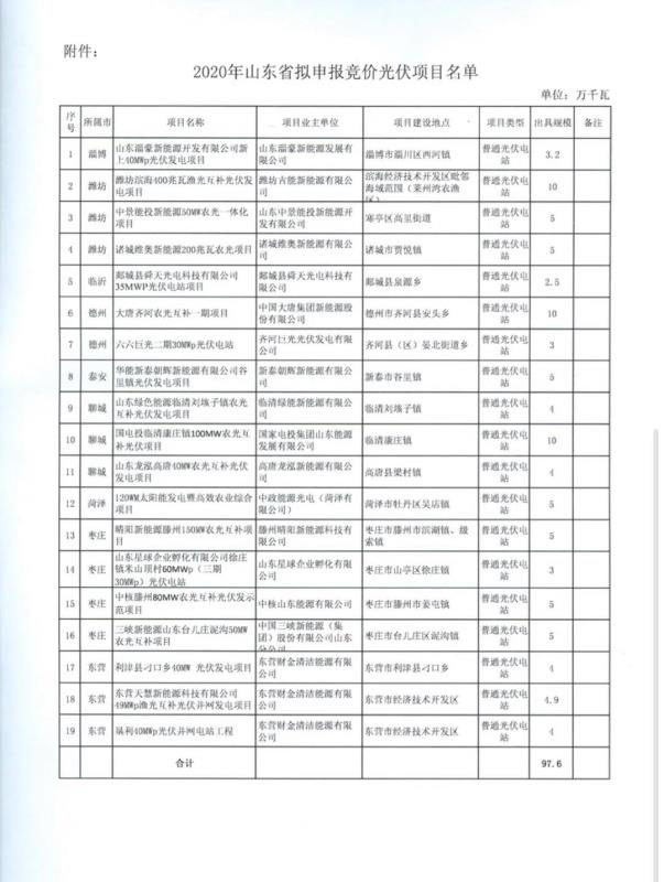 6月5日,國網(wǎng)山東發(fā)布《關于2020年擬申報競價光伏項目意見的函》,其中公布了2020年山東參與競價的光伏電站項目共計19個項目規(guī)模為97.6萬千瓦,并且根據(jù)申報項目承諾,將按項目裝機規(guī)模20%考慮配置儲能,儲能時間2小時,可以與項目本體同步分期建設。預計儲能此批儲能總規(guī)模將達195.2MW/390.4MWh。詳細文件如下: