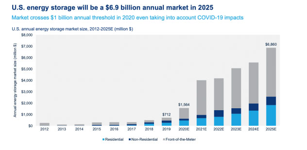 該公司預(yù)計(jì)美國(guó)2020年儲(chǔ)能部署裝機(jī)容量約為1.2GW,市場(chǎng)規(guī)模仍將超過(guò)10億美元大關(guān)。根據(jù)《美國(guó)儲(chǔ)能監(jiān)測(cè)》報(bào)告,到2025年,這一數(shù)字將接近69億美元。該公司預(yù)計(jì)住宅、非住宅和用戶側(cè)儲(chǔ)能細(xì)分市場(chǎng)將顯著增長(zhǎng)。而用戶側(cè)儲(chǔ)能成為今年規(guī)模最大的細(xì)分市場(chǎng),并將繼續(xù)增長(zhǎng)。