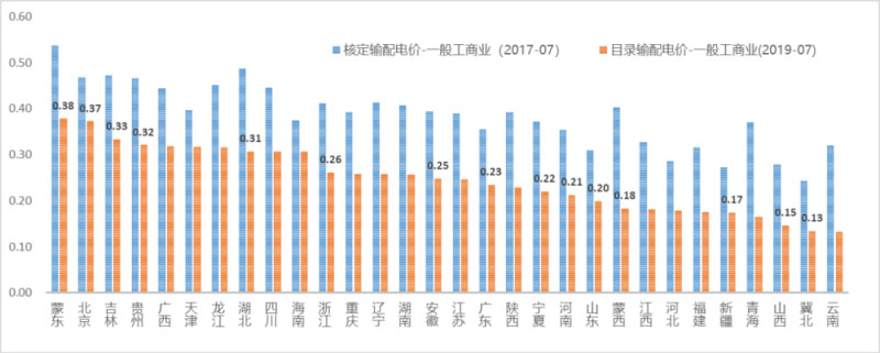 結(jié)果顯示,全國不滿1千伏一般工商業(yè)用戶含稅輸配電價的算數(shù)平均值,每千瓦時從17年0.385元降至19年0.245元,減少0.140元;不含稅輸配電價從0.329元降至0.217元,減少0.112元。其中,蒙西和青海含稅輸配電價每千瓦時降價超過2毛錢。