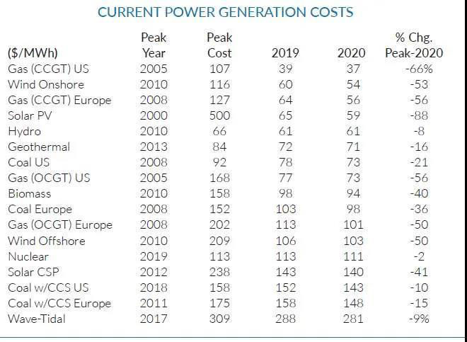 根據(jù)Energy Intelligence雜志匯總的數(shù)據(jù),2000年以后全球各類發(fā)電技術(shù)全生命周期的平準(zhǔn)化成本曾經(jīng)達到過的峰值(及年份)、2020年的最新成本以及2050年預(yù)測成本如下: