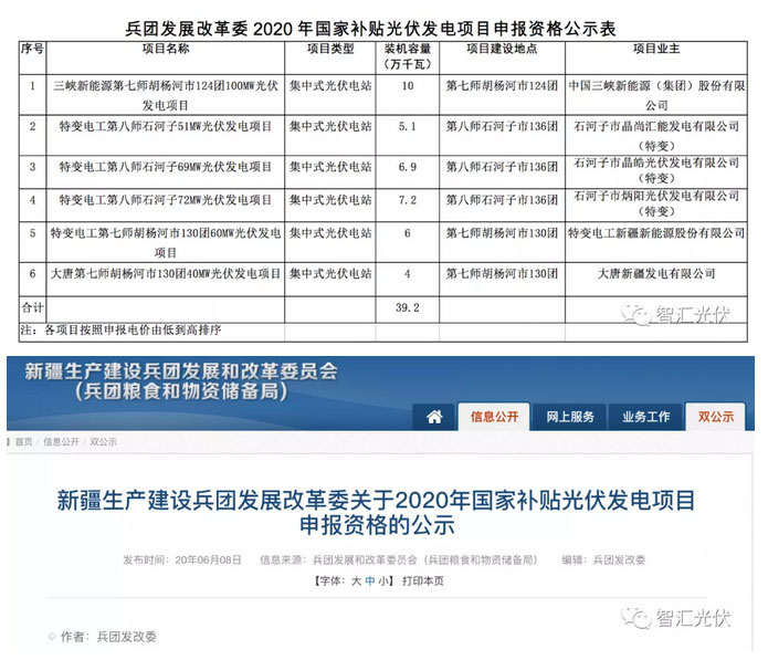 近日,新疆建設(shè)兵團(tuán)發(fā)展改革委發(fā)布了《2020年國(guó)家補(bǔ)貼光伏發(fā)電項(xiàng)目申報(bào)資格公示表》,共39.2萬kW,根據(jù)公示項(xiàng)目: