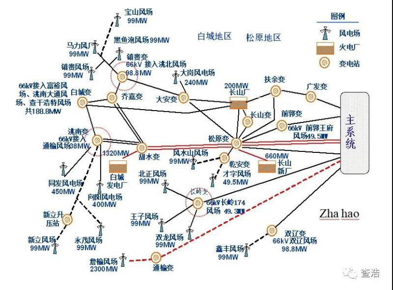 下面兩張圖是早期的新能源場站接入電網的示意圖,大體可以看出,早期投運的新能源電站大多位于電網末端,開發(fā)相對集中,往往是多個電站連片匯集接入到電網。